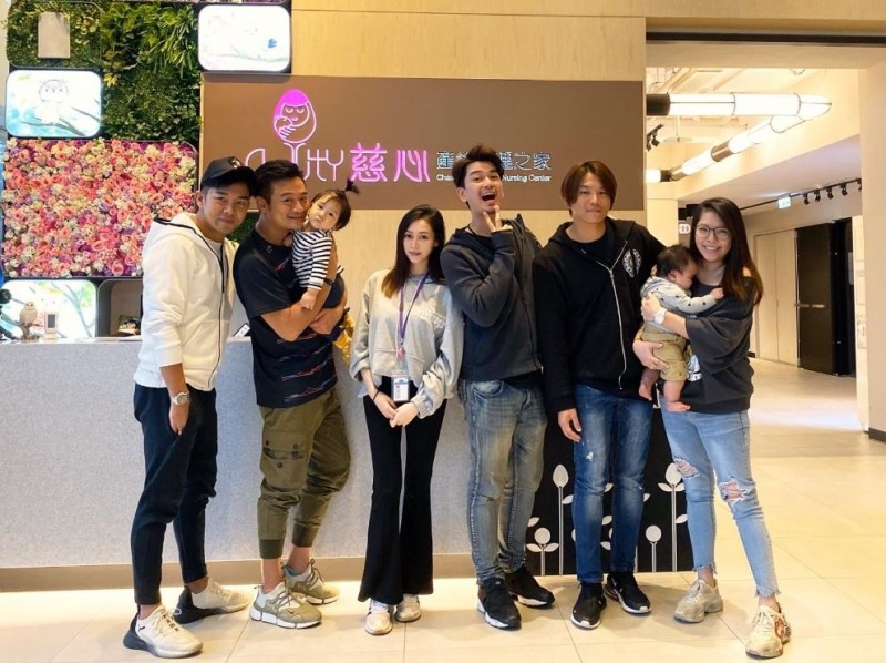 潘逸安(右3)邀請謝承均(左)、林佑星(左2)、Mei(右)、阿弟(右2)到產後護理之家看女兒米估。(艾迪昇傳播提供)