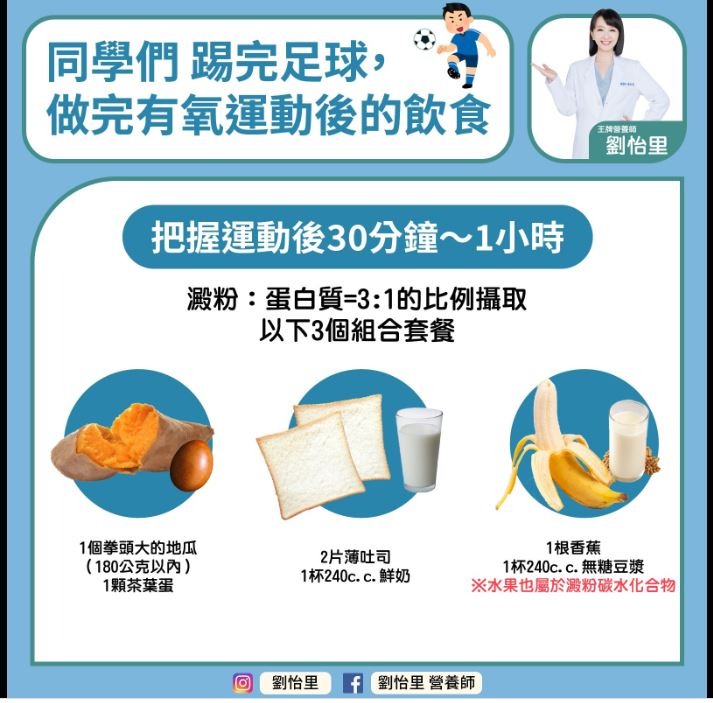 劉怡里表示,踢完足球或做完有氧運動後的飲食原則如下: