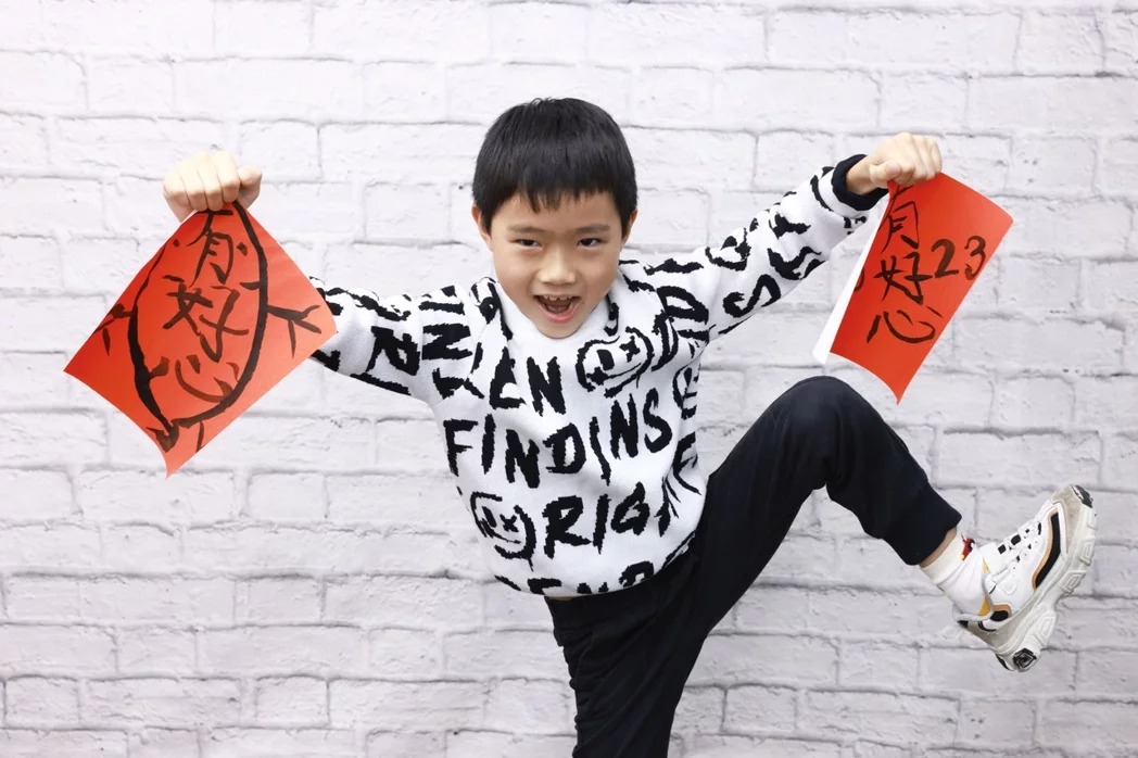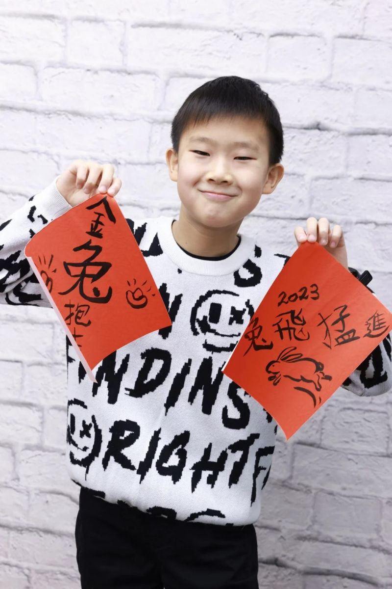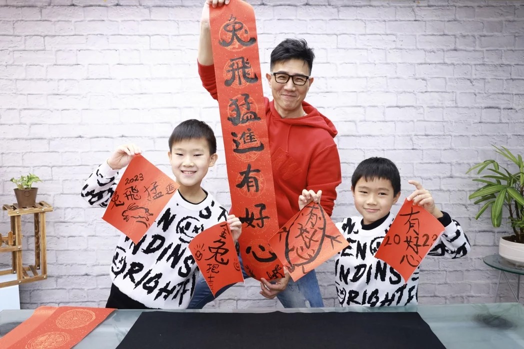 蔣偉文的兒子一個9歲一個7歲,老大個性謹慎害羞,小兒子活潑大方反應極快,小兒子選擇寫「有好心」,笑說因為小學一年級的他只會寫這三個字。老大則希望新的一年功課能突飛猛進,所以兔年寫下「兔飛猛進」。蔣偉文則集兩個兒子的大成寫下「兔飛猛進有好心」,對兩個兒子的表現,他說:「說真的寫得不錯,跟我小時候差不多,很有自己的風格。」