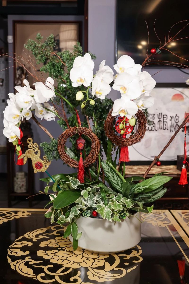 因為家裡供佛,她20幾年來都會買花拜拜,進而產生興趣自學花藝,想過投資花店嗎?她連忙搖頭「不行啦,我什麼三腳貓功夫」,謙稱功力普普,只是喜歡鑽研、觀察他人設計。她說家中本來就會放盆落地的白色蘭花,這次選擇蕨類、黃金葛等綠色植物搭配,並以象徵平安吉祥、招財進寶的紅色吊飾點綴,相當應景。