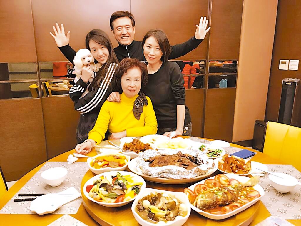 ▲李翊君(右起)與老公檢場、女兒香奈兒及李媽媽(前)過年圍爐。(藝人提供)