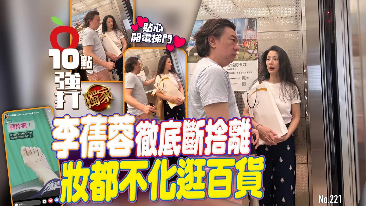 只見照片當中,李蒨蓉大素顏展現天然美,她胸前抱著1大袋日本清酒購物袋,和老公李德立一同搭乘電梯,李蒨蓉留著一頭長捲髮,穿著白色短T桖、肩背麻布袋、搭配黑色寬鬆休閒褲,在電梯內和拿著1把大雨傘的老公話家常,隨後,電梯來到B1美食街,李蒨蓉率先往前準備步出,李德立見狀立刻上前按住電梯開門鈕,等李蒨蓉安全離開後,才放心放手緊跟在她身後。