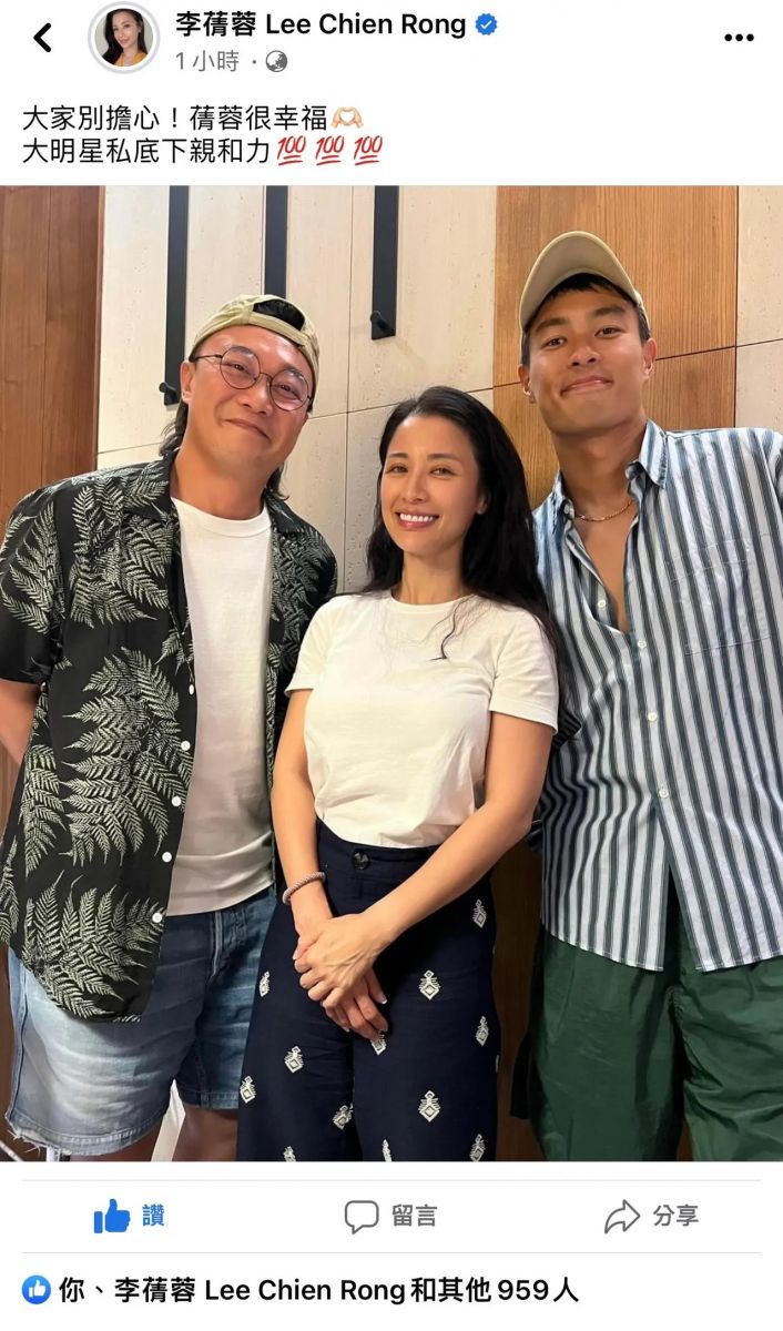 ▲隔日,李蒨蓉(中)在粉專發出和陳奕迅、楊祐寧合照,表示希望「大家別擔心!蒨蓉很幸福」。翻攝李蒨蓉臉書