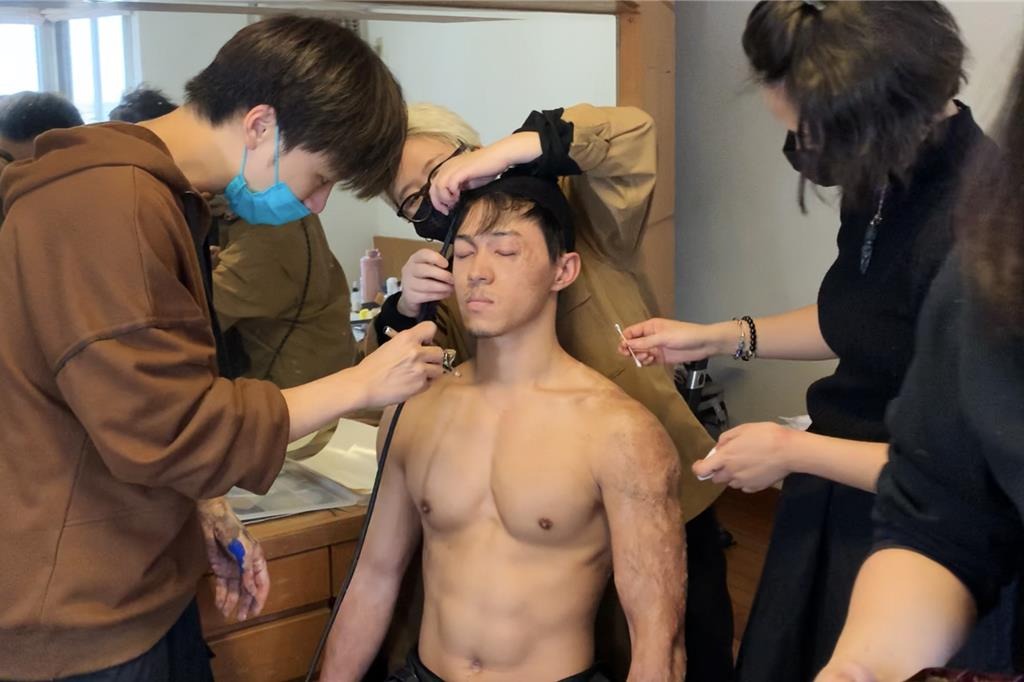 ▲游書庭一身肌肉,被特殊化妝人員笑虧太精壯。(艾迪昇傳播提供)