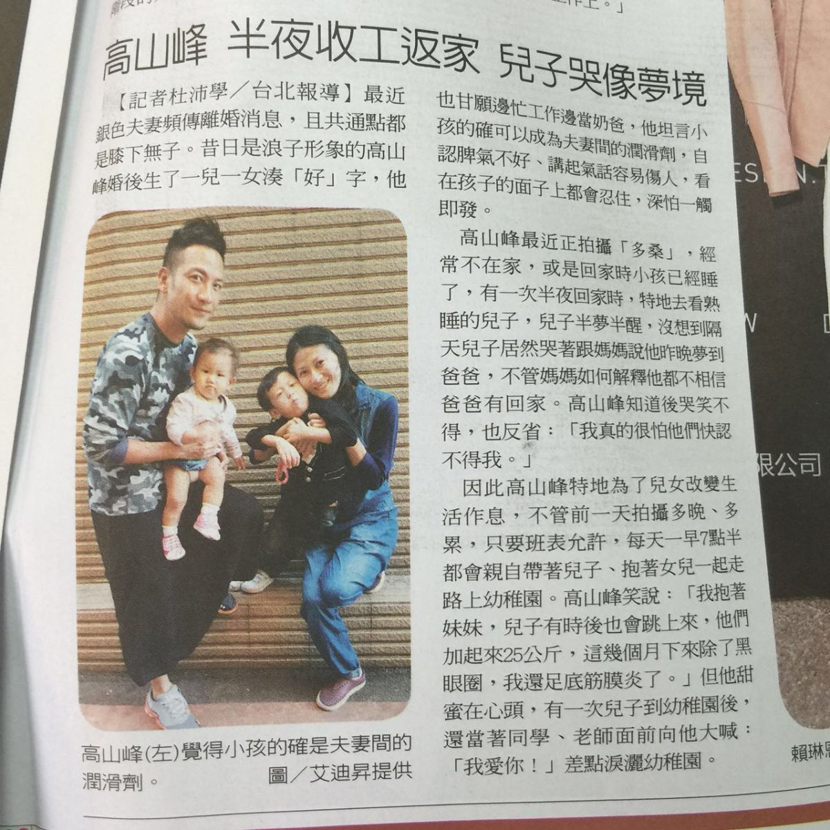 高山峰最近正拍摄「多桑」,经常不在家,或是回家时小孩已经睡了,有一次半夜回家时,特地去看熟睡的儿子,儿子半梦半醒,没想到隔天儿子居然哭着跟妈妈说他昨晚梦到爸爸,不管妈妈如何解释他都不相信爸爸有回家。高山峰知道后哭笑不得,也反省:「我真的很怕他们快认不得我。」