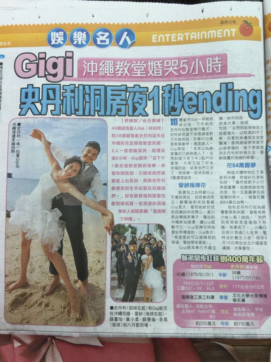 【蔡维歆╱台北报导】40岁通告艺人Gigi(林如琦)和38岁部落客史丹利前天在沖绳的克菈薇塔教堂完婚,2人一度感动泪哭,婚礼长达5小时,Gigi直唿:「从下午1点走进教堂听到音乐,接着牧师致词、交换戒指然后宾客上台致词,我跟史丹利都感受到全宇宙都在祝福我们。」好友苏慧伦和路嘉怡都到场祝贺。但浪漫的洞房夜新人却因累瘫,「直接倒下秒睡」。