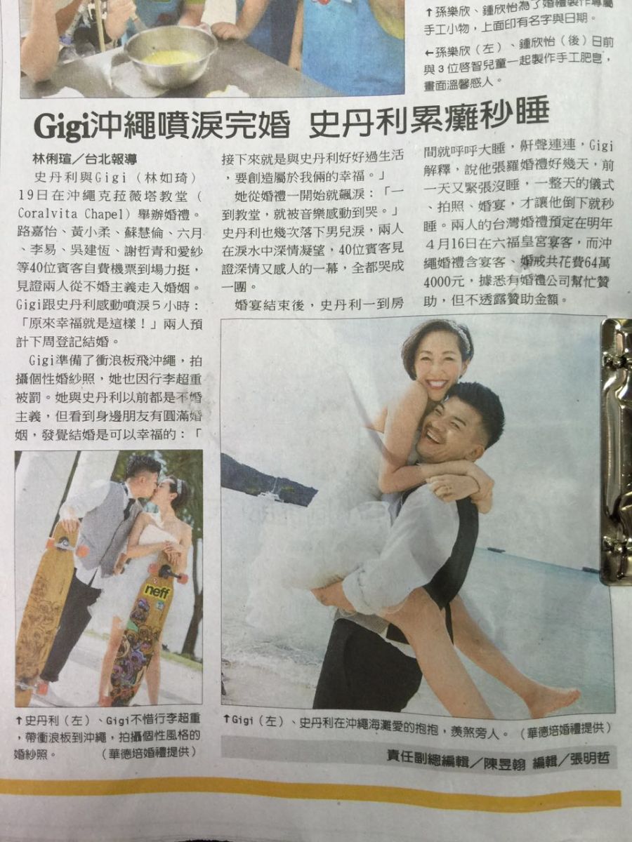 史丹利与Gigi(林如琦)19日在沖绳克菈薇塔教堂(Coralvita Chapel)举办婚礼。路嘉怡、黄小柔、苏慧伦、六月、李易、吴建恆、谢哲青和爱纱等40位宾客自费机票到场力挺,见证两人从不婚主义走入婚姻。Gigi跟史丹利感动喷泪5小时:「原来幸福就是这样!」两人预计下周登记结婚。