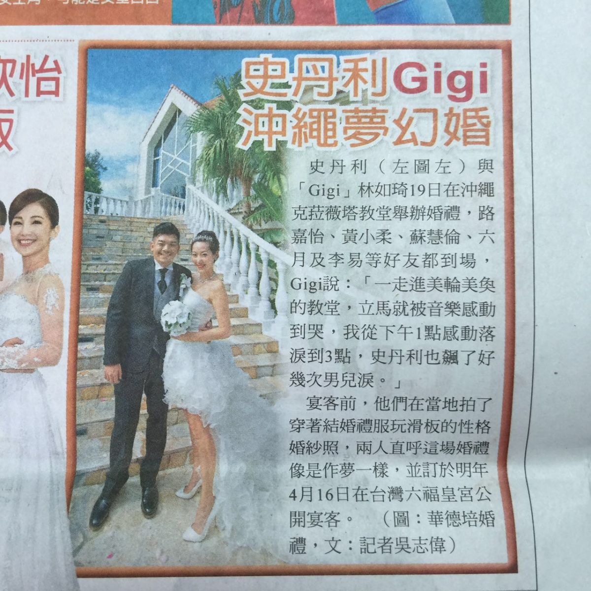 史丹利与「Gigi」林如琦19日在沖绳克菈薇塔教堂举办婚礼,路嘉怡、黄小柔、苏慧伦、六月及李易等好友都到场,Gigi说:「一走进美轮美奂的教堂,立马就被音乐感动到哭,我从下午1点感动落泪到3点,史丹利也飙了好几次男儿泪。」