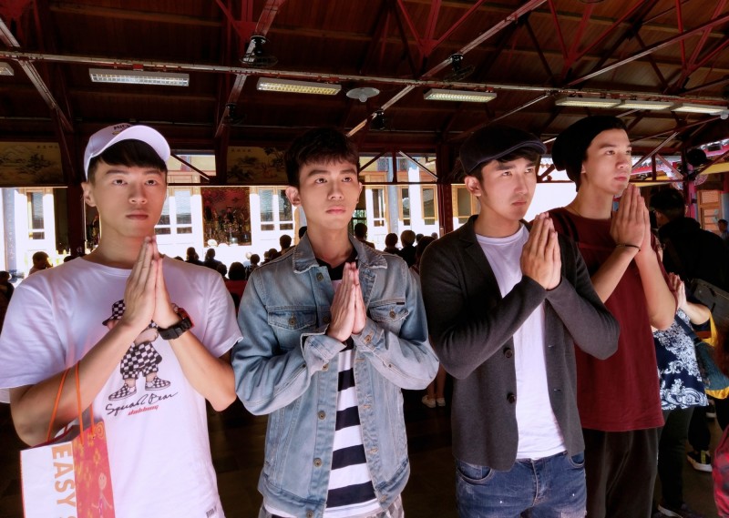 四人特地到庙里拜拜祈求一切顺利。(艾迪昇传播事业提供)