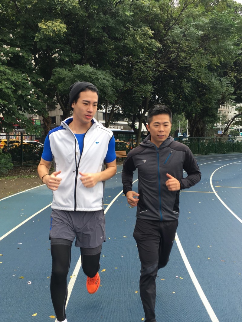 谢毅宏(左)跑到气喘吁吁,林义杰要他再加油。(艾迪昇提供)
