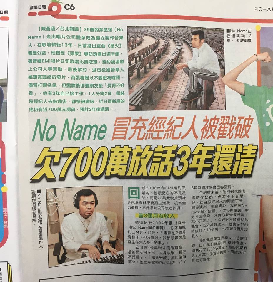 39岁的余荃斌(No Name)从唱片公司体系摇身独立制作音乐人,在歌坛耕耘13年,日前推出单曲《星火》响应公益,他接受《苹果》专访,分享出道至今点点滴滴,他曾是EMI唱片公司歌唱比赛冠军,签约后却碰上公司人事异动,最后解约收场,结束兵役后获音乐人姚谦赏识终于发片,首张专辑以不露脸为噱头,虽打响名气,但合约结束后,他长达3年靠自己接工作、卖歌为生,他笑说当时1人分饰2角,装成经纪人去敲通告,却被对方识破,让旁人听了直唿尴尬。