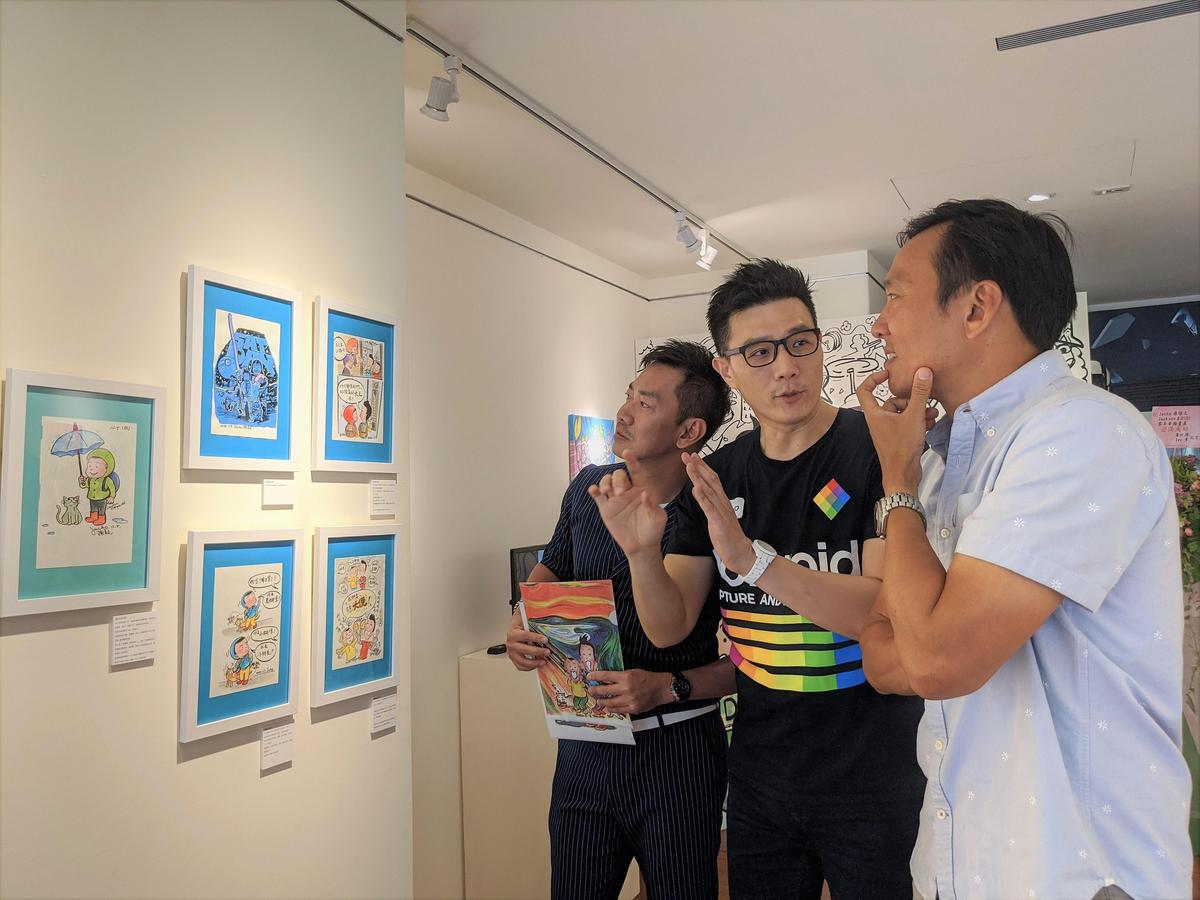 蒋伟文(中)开画展,「三片吐司」昔日团员艾力克斯(右)和江俊翰特地合体捧场。(艾迪昇传播提供)