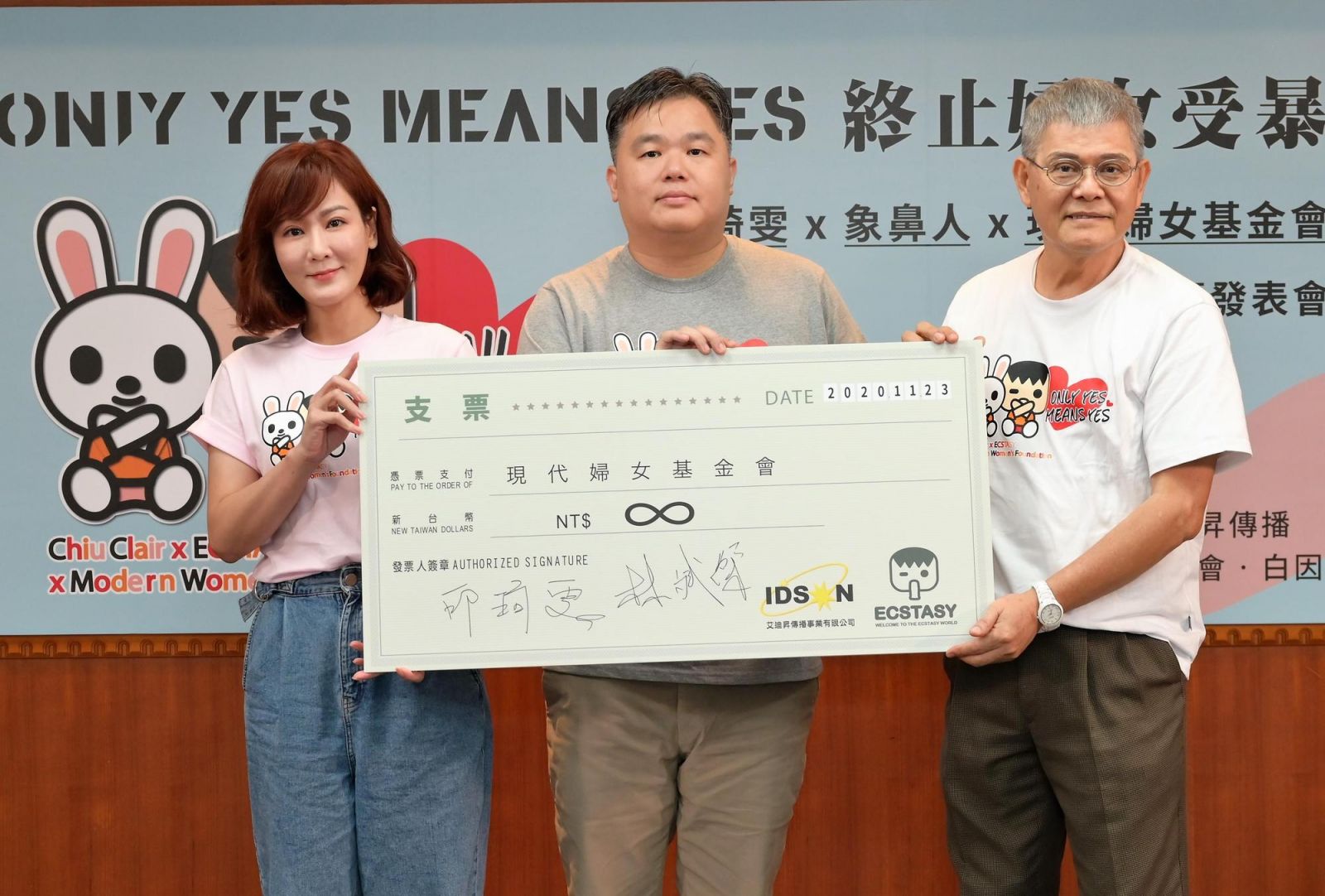 ▲邱琦雯(左起)、象鼻人总经理林斌杰与现代妇女基金会执行长范国勇一同为公益发声。(现代妇女基金会提供)