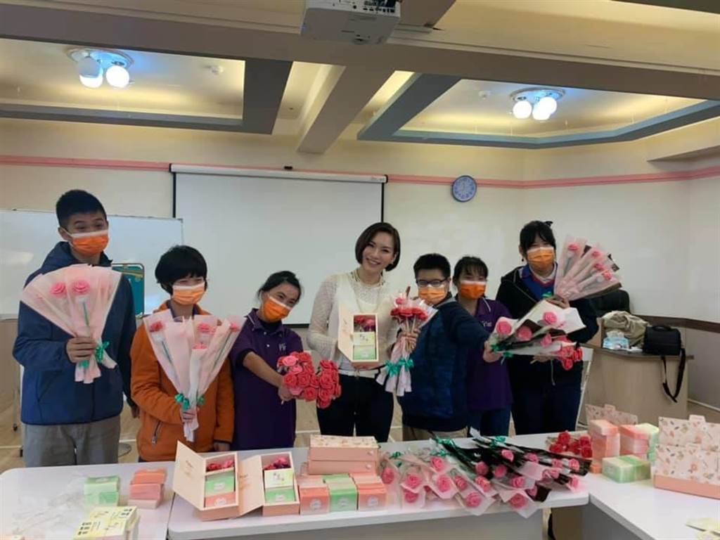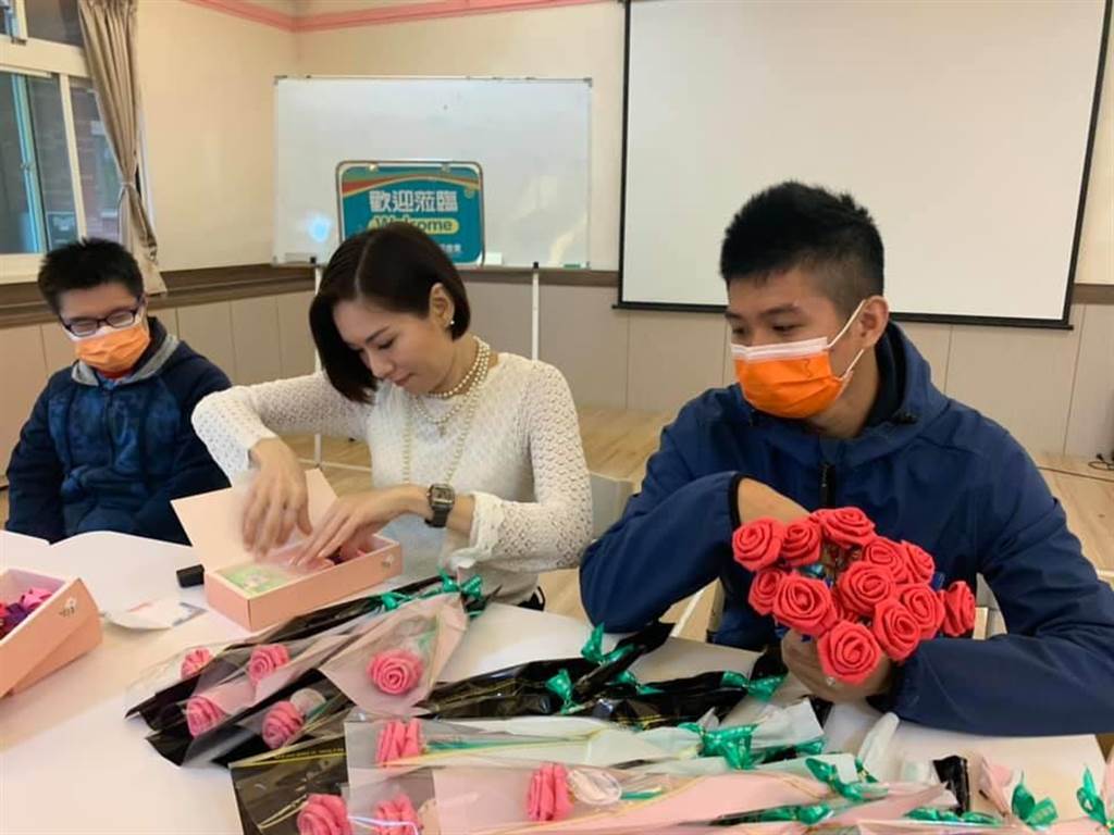 基金会人员表示,今年母亲节义卖产品有憨儿手作玫瑰花,也有新产品手工花皂礼盒,义卖金额从30元至388元,任何一张订单都能让憨儿们感到开心,林佳仪也和憨儿们忙着贴贴纸、装盒准备出货,希望社会大众一起来帮忙,让憨儿们有订单,也就是给他们一份工作。