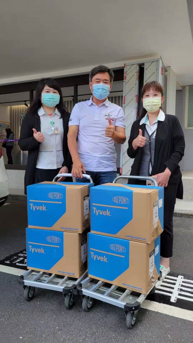 ▲检场(中)捐赠防护衣给第一线医护人员。图/艾迪昇传播提供