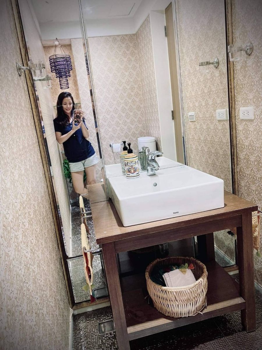 客厕虽小,但是反映主人品味功力的展场,15年前蒨蓉的设定,至今仍很有梗,「这个独立小空间的风格,可以大异于家人常用的主空间,大胆一点,让客人有反差的惊喜感。主题风是bling bling的迪斯可(银闪闪的马赛克地砖),混搭贵气的异国皇宫(镶金印花华丽壁纸)。第一次进到厕所的客人,一定会「大惊小怪」,很有成就感啰。」