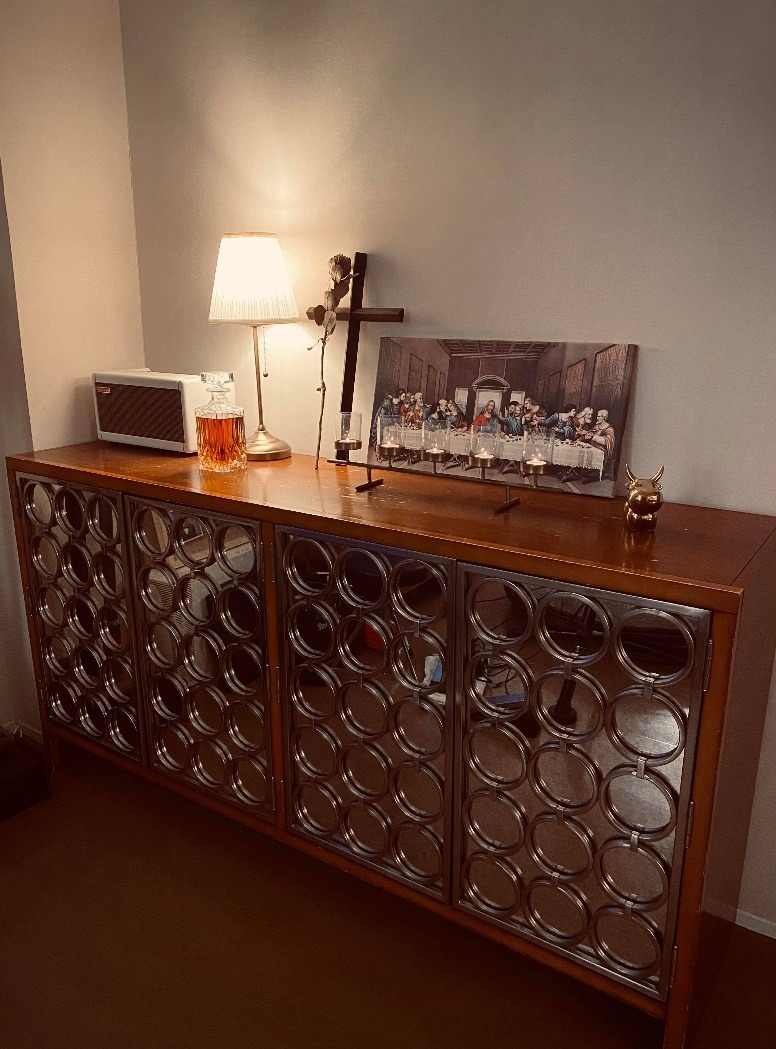 碗柜的檯面,摆放自己喜欢的十字架、画、花,全家福、香氛小物,每天换新,是「跪」妇生活中的小小情趣。