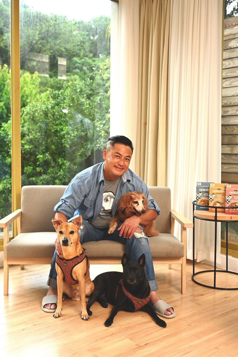 ▲江宏恩带着家中毛小孩一起拍摄代言广告。(图/艾迪昇传播提供)