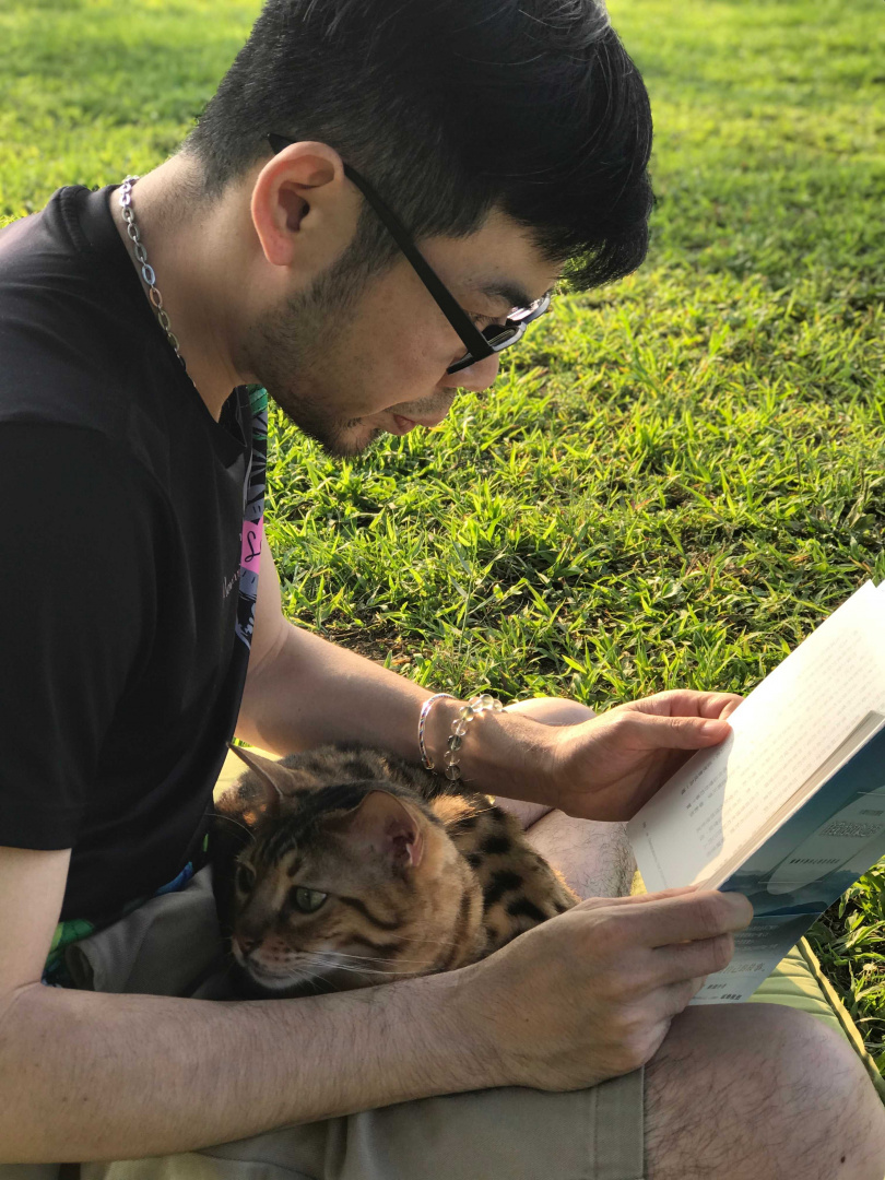 6岁大的豹猫威利,当年是因为朋友家生了一窝小猫分送给No Name的,他表示威利体型大,胆子也不小,有次去四四南村的宠物展演出,有一只德国狼犬接着要做特技表演咬哑铃举重,「我们在后台等的时候,威利一直很想冲过去狼犬那边,很像是要护地盘的感觉,因为这样的经验,所以后来想不要带出门比较好。」