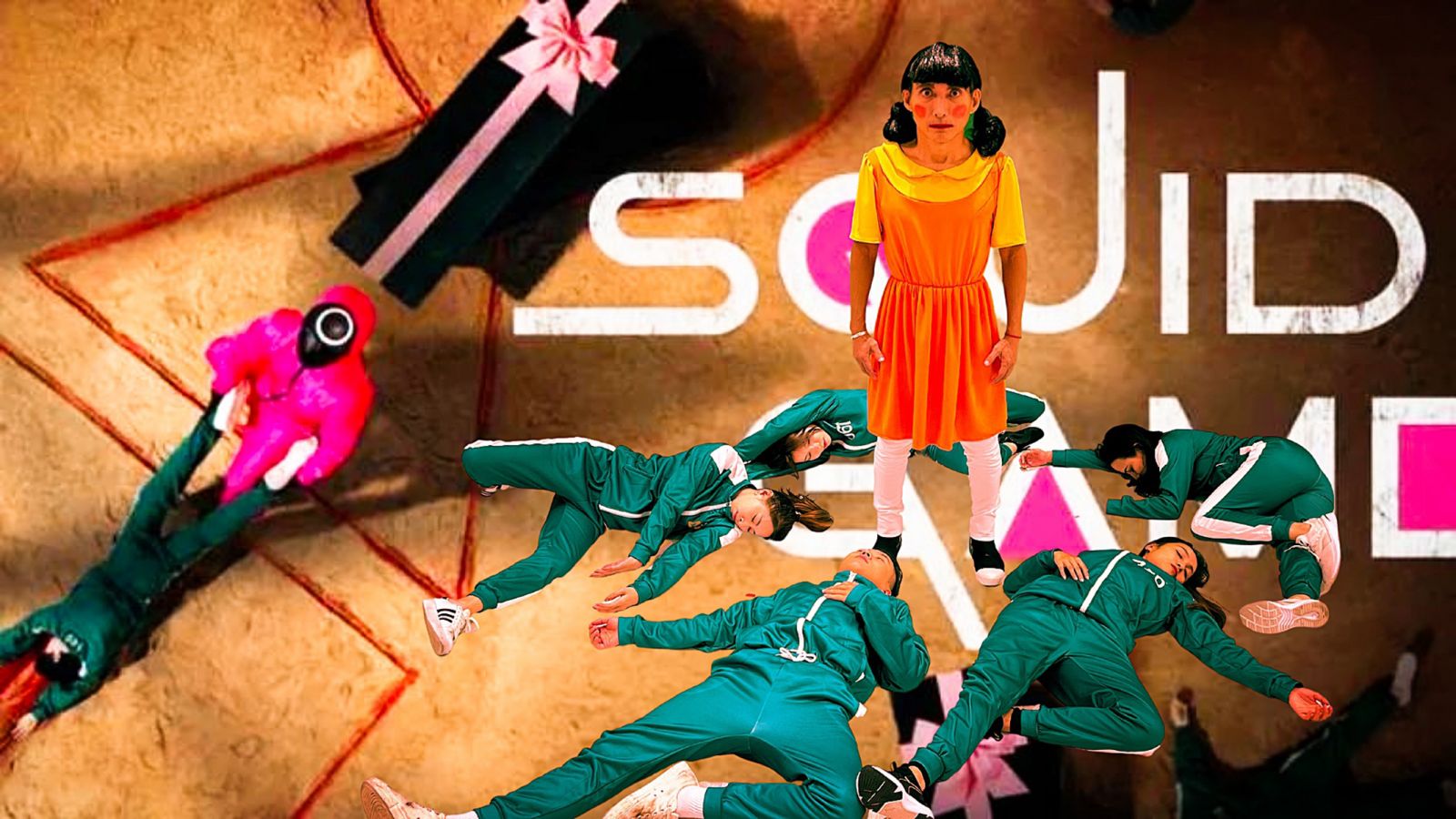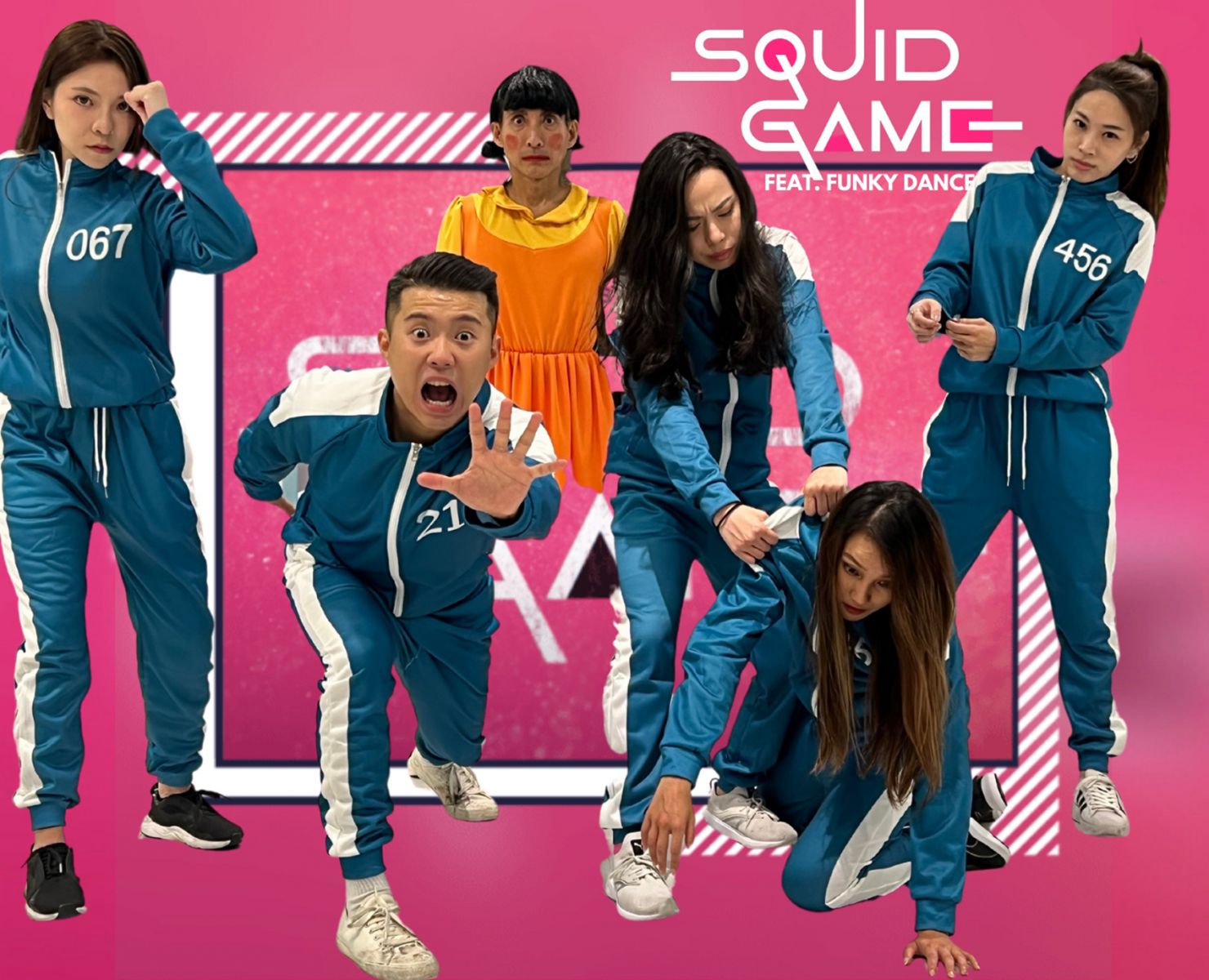 潘若迪(左三)復刻《鱿鱼游戏》木头人娃娃,和旗下明星教练拍摄健身操影片。(艾迪昇传播提供)