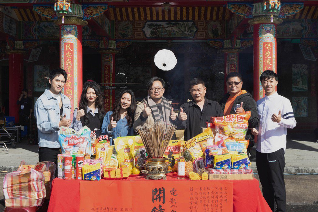 左起潘君仑、白痴公主、陈妤、导演谢志文、澎恰恰、陈文山、游书庭出席「鬼天厦」开镜。图/华映提供