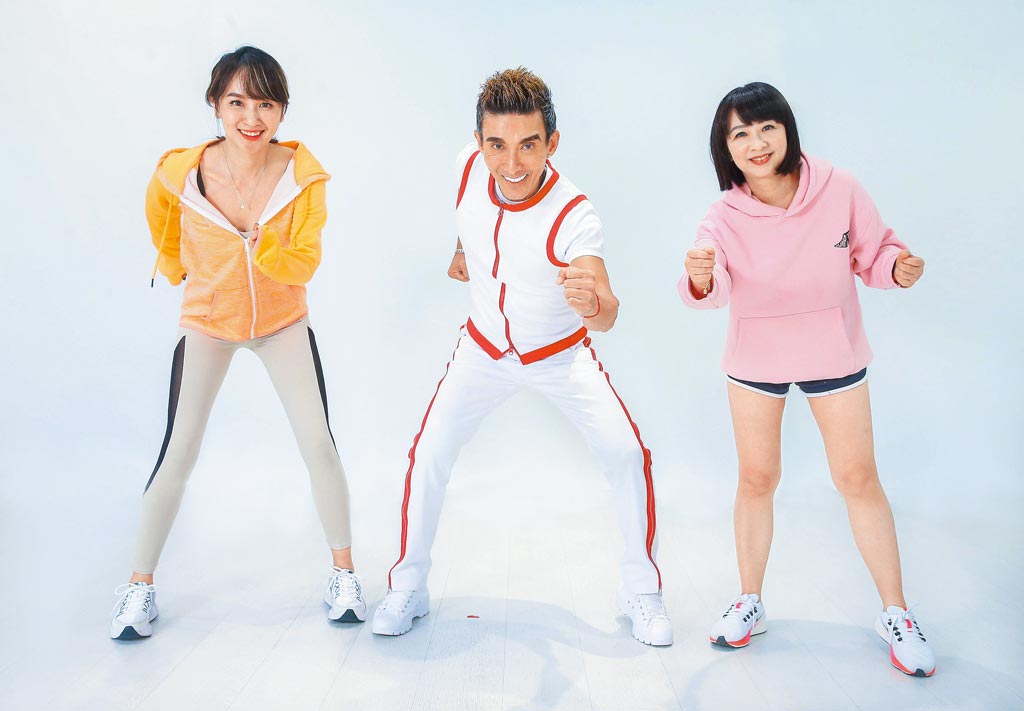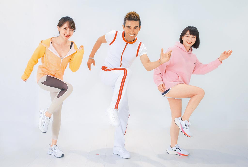 潘若迪(中)带领蔡逸帆(左)、刘怡里教大家减脂操。先面向左边,双手如跑步姿势并将右脚抬起重复做4次后换边,共做3组,可锻鍊臀大肌与股四头肌,并达到增加核心肌群的效果。(粘耿豪摄)