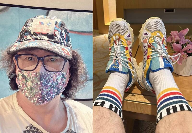在下榻饭店,林国基拍下脚穿七彩球鞋,头戴绚丽颜色的棒球帽,搭配五颜六色点点口罩,吐露已二年多没出国为自己添加行头,「于是非常有效率的一次补足,现在的心情也都是彩色的!」