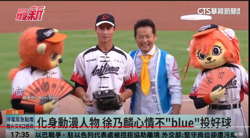 中职统一狮队,今年「国狮无双」主题日和动漫「中华一番」联名,国庆日在台南棒球场举办,综艺天王徐乃麟担任开球嘉宾,更打扮成动漫角色「谢师傅」,虽说赛前只小练一下,但站上投手丘,投出好球。主持人说:「来欢迎徐乃麟乃哥。」综艺天王徐乃麟,因为神似动漫「中华一番」里头的解师傅,这回特地穿上同款服装,开球嘉宾徐乃麟VS.主持人说:「我就是心情很blue,心情很blue因为这个颱风,所以延到今(10)日,看了气象报告台南的天气相当好。」
