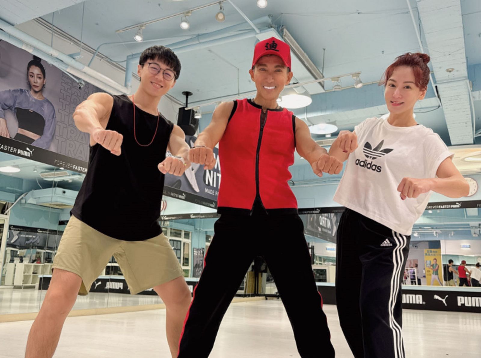 ▲邱琦雯(右)在游书庭的陪伴,首次上潘若迪(中)的有氧课程。艾迪昇传播提供