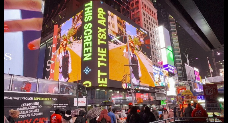 ▲潘若迪全民运动单曲《Here We Go》MV在纽约时代广场播放。(艾迪昇传播提供)