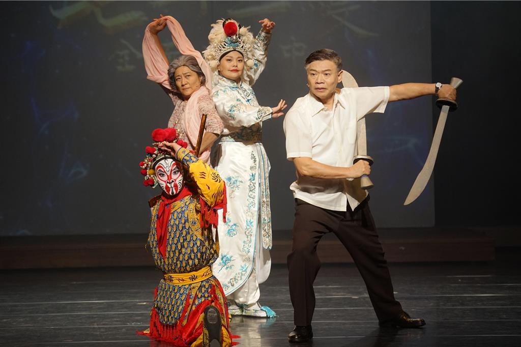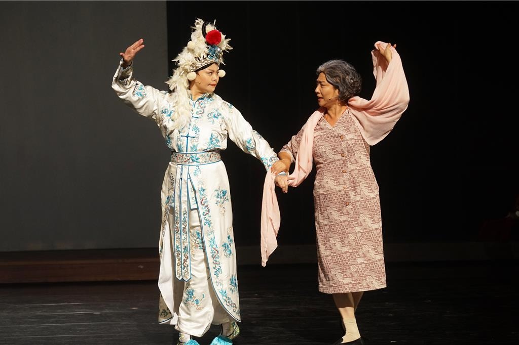 ▲林嘉俐(左)以豫剧装扮和杨丽音一起又唱又跳。(故事工厂提供)