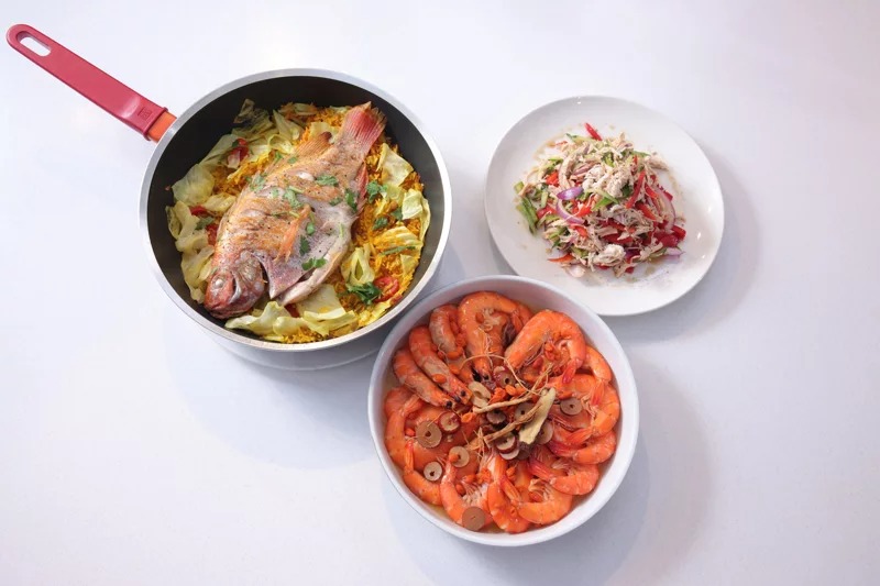蒋伟文表示「黄金红鱼炊饭」使用便宜又营养的尼罗红鱼,搭配姜黄粉将米饭上色,整道菜充满过年欢庆的味道,「尼罗红鱼大概90元就可买到,肉很厚又耐煎煮,最适合拿来做炊饭」。「人生难得一醉的蔘鬚绍兴醉虾」则是他最推荐的快速懒人料理,只要把虾子煮熟,泡在党蔘、绍兴酒、米酒、枸杞等汤汁中,在冰箱浸泡过一夜就完成,他开玩笑:「每吃一只虾子,就要念一次菜名,来测验是否已经酒醉。」而刘怡里料理的「五福临门手撕鸡」,里面充满青椒、红椒、小黄瓜、洋葱等膳食纤维,加上鸡肉的蛋白质,是一道营养均衡的菜色,她解释:「过年喝鸡汤,常会剩下鸡胸肉,拿来做这道菜最适合了。」