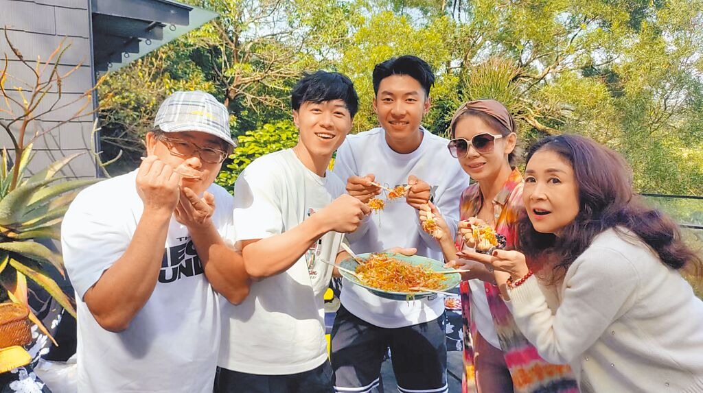 ▲林美贞(右二)特别准备家乡传统「捞鱼生」,和林国基(左起)、游书庭、刘丞、曲艾玲一起招福。(艾迪昇传播提供)