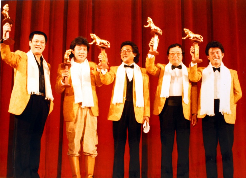 「黄金五宝」倪敏然(左起)、张菲、徐风、罗江、检场红极一时,手上各拿一个「金虎奖」奖座。(资料照)