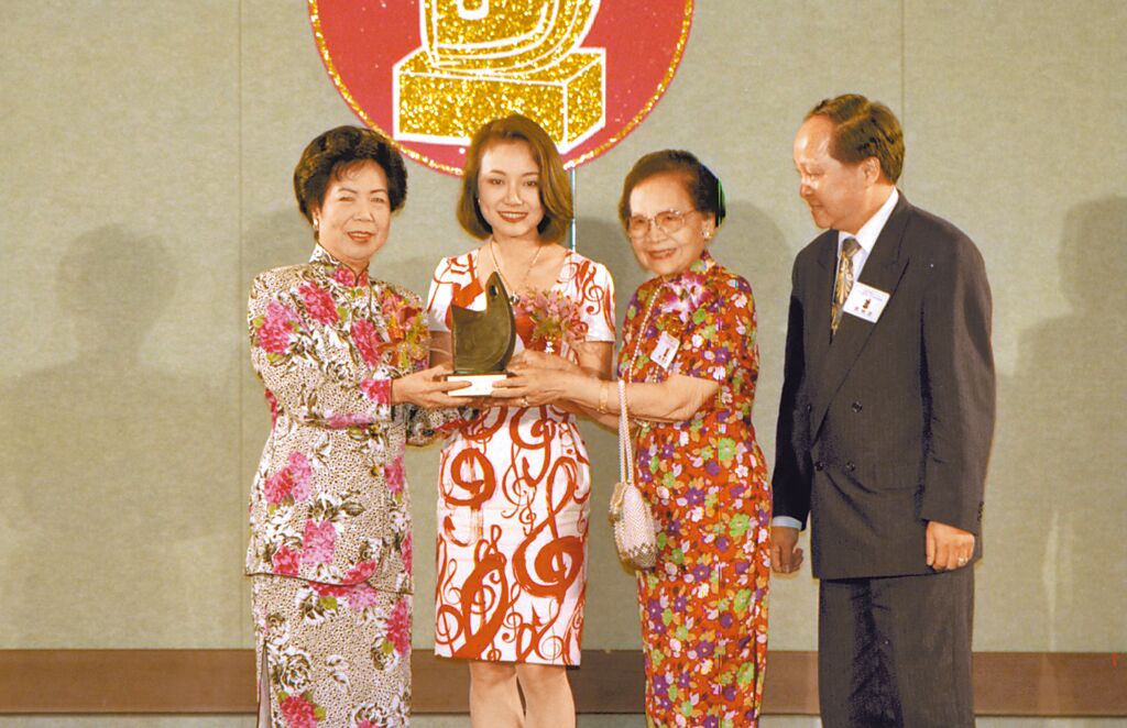 吴冠英(左二)当年从总统夫人曾文惠(左)手中领到「十大杰出女青年奖」,右起为她的哥哥吴建国、吴妈妈。(资料照片)