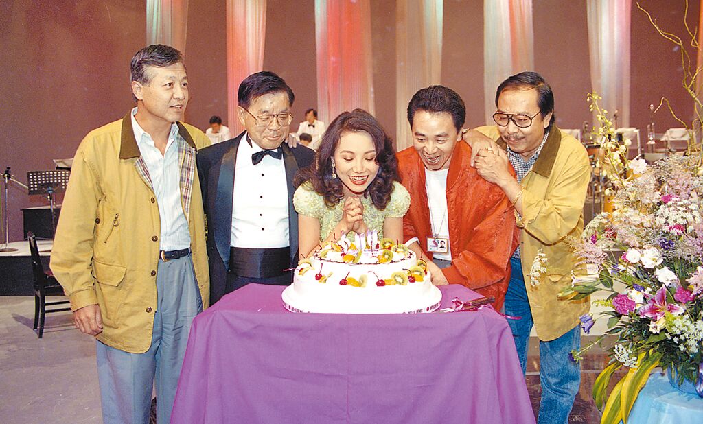 导播组组长白国嘉(左起)、中视大乐队指挥林家庆、吴冠英、导播林添、导播组副组长史俊明,当年一起庆祝节目《乐自心中来》满600集。(资料照片)