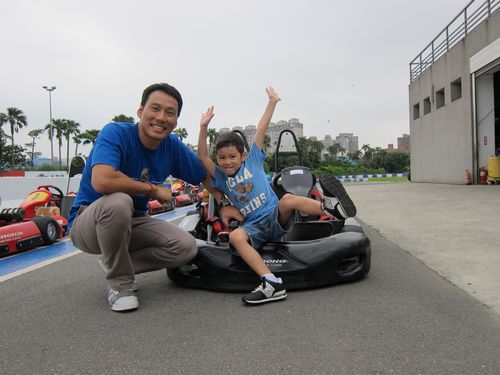 接着两人忍住笑,坐上可以一起驾驶的亲子卡丁车,兴奋的往车道开去,不过可能不习惯开这样的车,一圈还没开完,就不小心开上旁边草丛卡住,吓的工作人员赶紧过去帮忙把车推回车道,好在经过一两圈的练习,艾力克斯越开越顺,速度也跟着加快,艾力克斯帅气过弯,旁边儿子也跟着爸爸一起出现过弯动作架式十足,事后两人满头大汗脱下安全帽,RYDER开心的说:“爸爸开好快,我的头就会跟歪来歪去,不过很好玩一点都不可怕,以后我也要自己开,一定开的比爸爸更帅。”