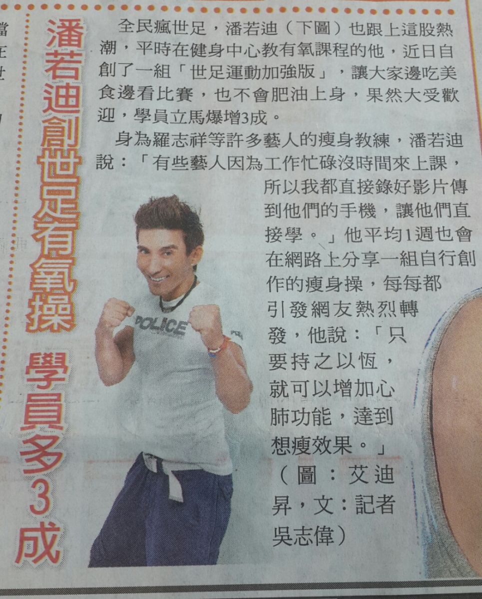 近来全民疯世足,有氧天王潘若迪的有氧舞也跟上世足热,近日他自创了一组“世足运动加强版”(网址:https://www.facebook.com/funkydance?fref=ts),让大家吃美食看比赛后,不要有留下油腻腻的身材。他说:『为了不让(一世足) 成千古恨,同学们,潘老师早就为你们打算了,世足运动加强版,全身动,保证精神亦亦,工作满意。而且大家如果熬夜看世足,这还能免得大家上班睡觉,下班尿尿,隔天迟到,还想睡觉的情况。』